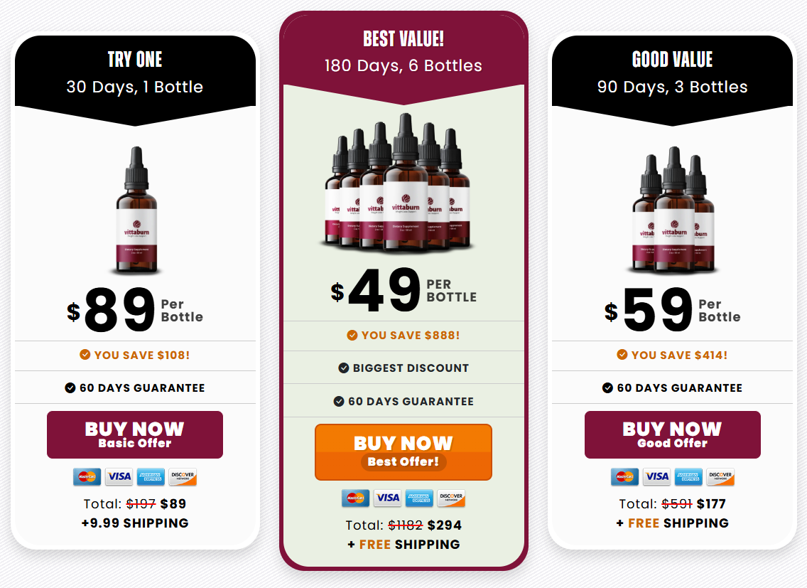 Currently, Vittaburn is backed by a 60-day money-back guarantee, giving you a risk-free opportunity to try it for yourself. Plus, multi-bottle packages include free shipping and the biggest discounts available. If you’re looking for a safe, natural, and powerful solution to support weight management and boost energy, Vittaburn is the right choice for you.